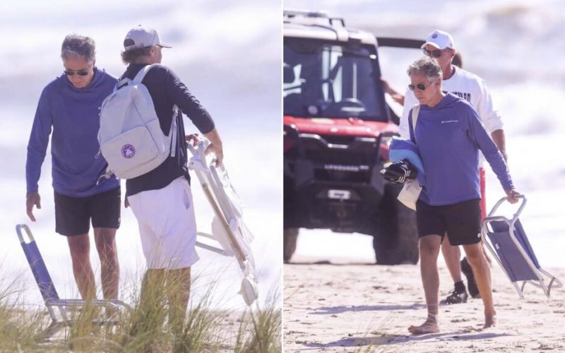 Photos showed the ex-Biden official in a blue long-sleeve shirt and black shorts, barefoot, gathering up his towel, tote bag, and folded chair before making what tabloids dubbed a “walk of shame” back to the parking lot. Large waves were still pounding the shoreline in the background.