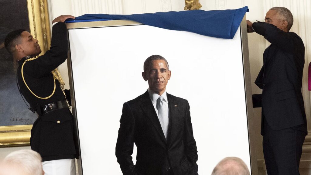The portrait is now at the top of the Grand Staircase inside the White House, alongside the portraits of former Presidents George H.W. Bush and George W. Bush.