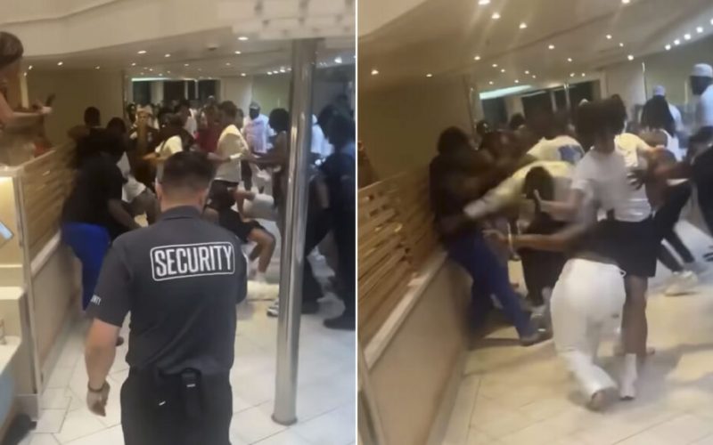 Video footage shows chaos erupting as several young cruisers traded wild punches, knocking each other to the ground while bystanders scrambled to avoid the scuffle. Shoes, phones, and personal items could be seen flying across the room.